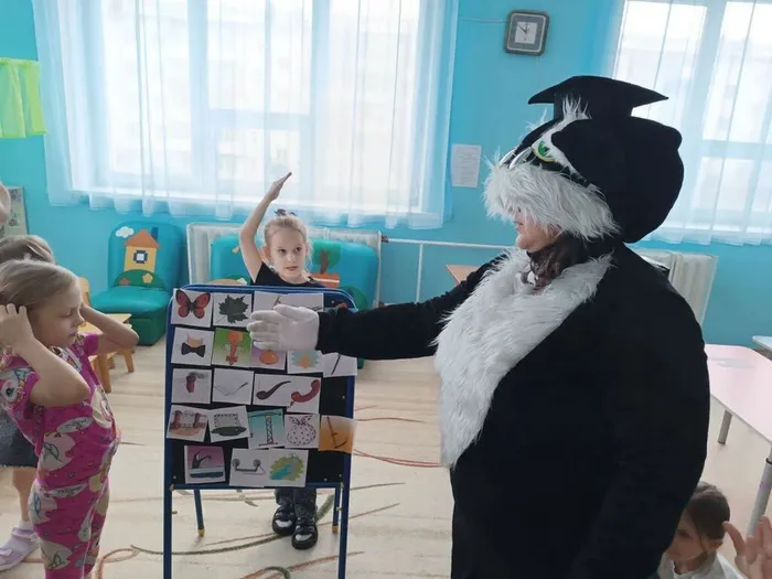 Игра с мячом «Слова наоборот» превратилась в весёлую разминку, где дети учились подбирать антонимы. Затем настало время многозначных слов. Малыши находили изображения разных вещей, которые обозначаются одним словом, таких как листочек растения и бумажный листочек; или ключ от двери и ключ-родник.
